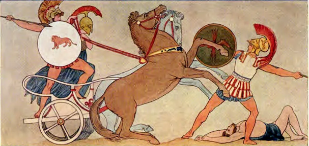 Троянская война, описанная в поэме Гомера «Илиада», стала для греков священным источником знаний о доблести. Центральным сюжетом войны стал гнев Ахилла, величайшего из героев, который отказался сражаться из-за спора с Агамемноном, но вернулся в строй, чтобы отомстить за гибель своего друга Патрокла. Противостоящий ему троянский царевич Гектор изображен как благородный защитник родины и семьи, павший от руки Ахилла.