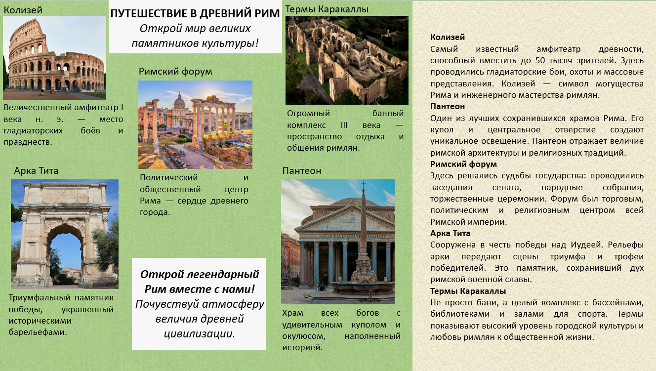 | Собрали исторические факты (о Цезаре, Августе, архитектуре, досуге). | Получили содержание (очерки) и иллюстрации (фотографии) для плаката. |