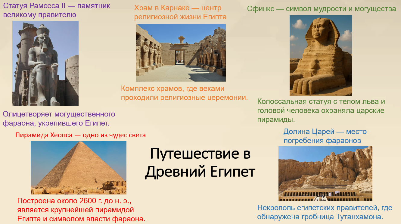 Мы узнали, что Древний Египет оставил множество уникальных памятников архитектуры и искусства, которые помогают изучать культуру и верования древних людей.