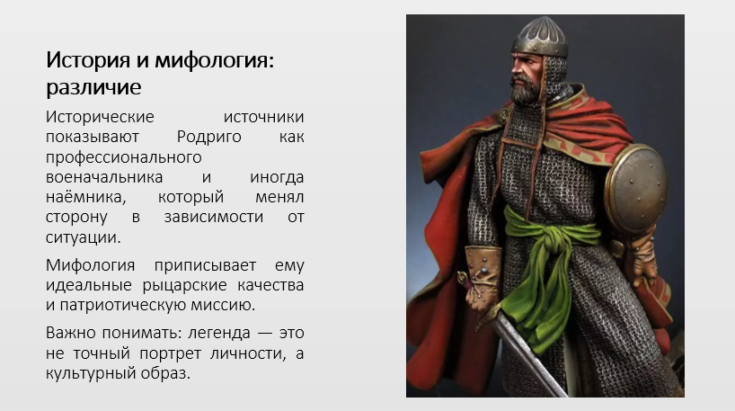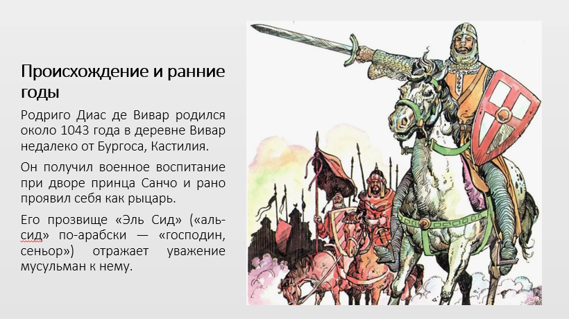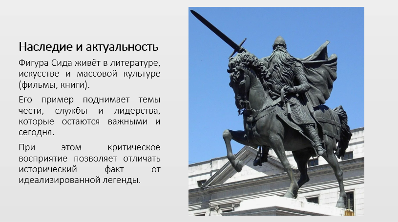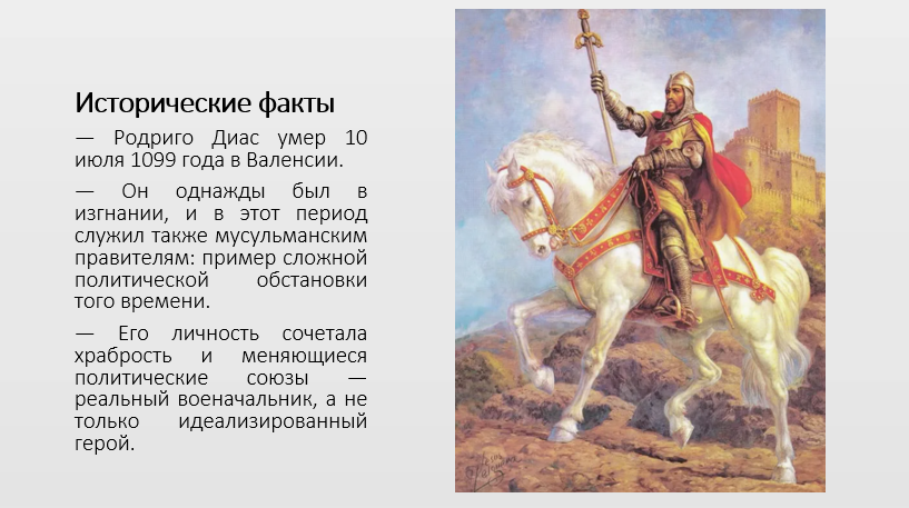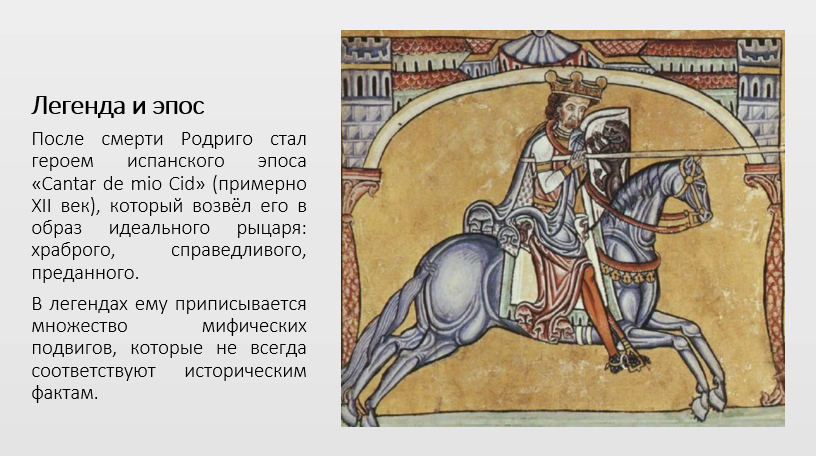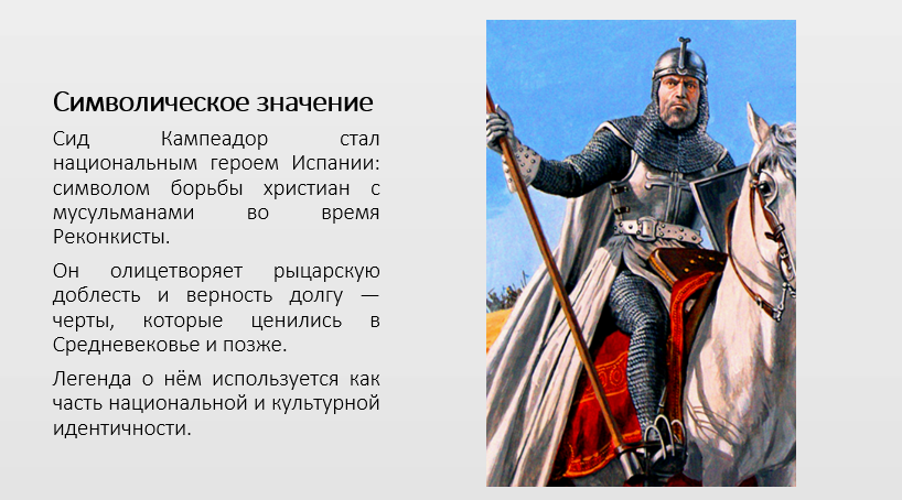 С помощью ресурсов Интернета или дополнительной литературы подготовьте рассказ с электронной презентацией (не менее 7 слайдов) на тему: Сид Кампеадор как историческая личность и герой легенд. Выступите с подготовленной презентацией перед классом.