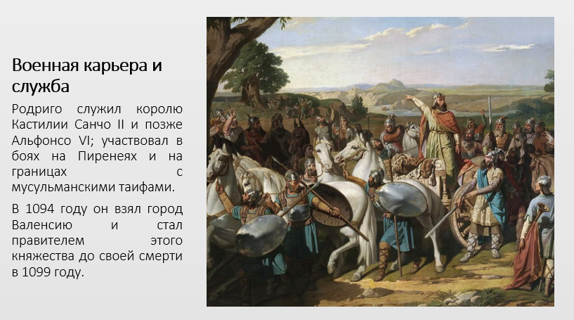 Главным достижением Сида стало завоевание Валенсии в 1094 году и правление там до смерти в 1099-м: он превратил город в самостоятельное княжество, опираясь на смешанное христианско-мусульманское население и наёмные дружины. Его арабское прозвище ас-Сид («господин») и испанское Кампеадор («победитель на поле брани») отражают репутацию умелого полководца.