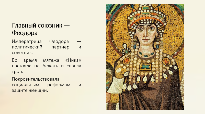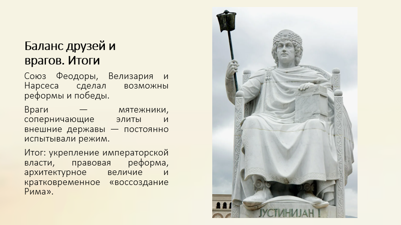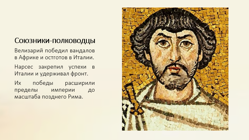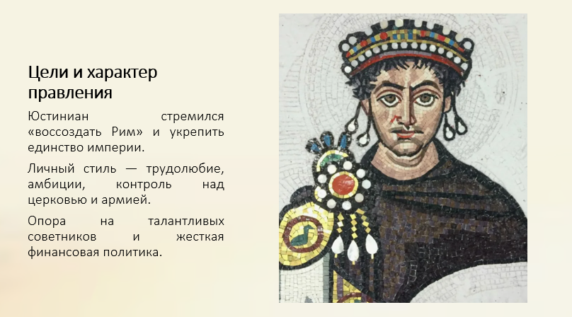 Добавить текст Вернуть оригиналЮстиниан I вошел в историю как правитель, который попытался вернуть миру величие Рима. На его стороне стояли люди исключительного масштаба. Императрица Феодора была не просто супругой, а соавтором власти: в час мятежа «Ника» ее решительность удержала Юстиниана на троне и позволила начать новую эпоху. Полководцы Велизарий и Нарсес превратили мечту в карту: Африка, Сицилия, Италия снова оказались под властью Константинополя. Их победы дали императору славу восстановителя империи.