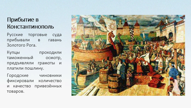 Добавить текст Вернуть оригиналРассвет только касается воды Золотого Рога, и русская ладья, отстояв ночь на якоре, подтягивается к пристани. Купец проверяет печати на тюках и грамоты, подготовленные в дороге. На берегу его встречает таможенный чиновник коммеркиона и переводчик; товары осматривают, записывают в опись, назначают пошлину. К полудню тюки с мёдом, воском, мехами и льном уже лежат в складском дворе неподалёку от пристани.