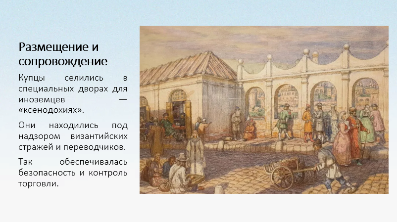 Добавить текст Вернуть оригиналКупец размещается в ксенодохии для иноземцев. Во дворе — колодец, лавки ремесленников, сторожевая будка. Оружие сдаётся на хранение, как велит городской порядок. Переводчик знакомит с распорядком дня и предупреждает о штрафах за бесчестный торг и попытку продавать «с рук» вне рынков.