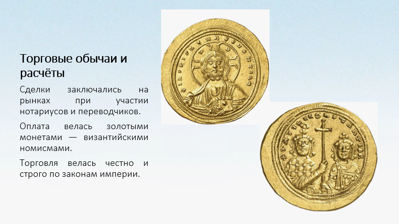 Добавить текст Вернуть оригиналПервым делом купец меняет часть серебра на византийские номисмы. Монеты взвешивают на рычажных весах, сверяя пробу. Клерк делает помету в счётной книге. Короткая запись о курсе нужна, чтобы не потерять в расчётах по завершении сделки.
