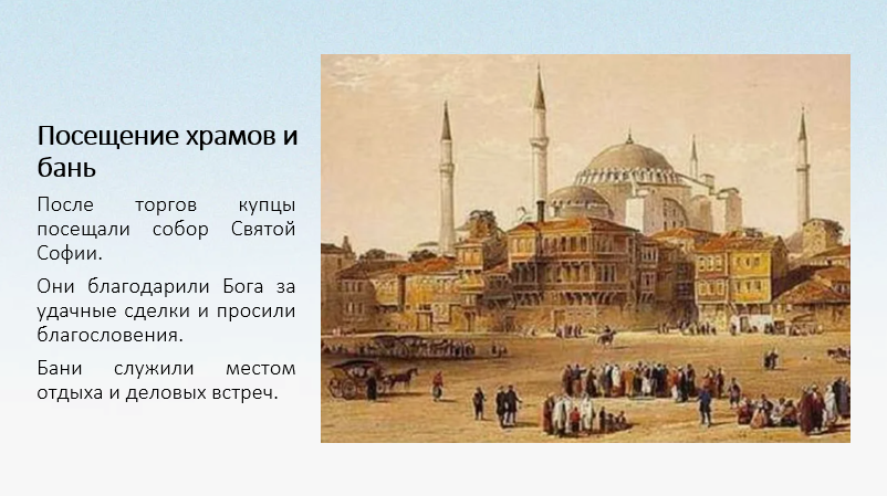 Добавить текст Вернуть оригиналК полудню купец заходит в Святую Софию. Краткая молитва и взгляд на купол — напоминание о величии города, где решается исход торгов. Здесь же назначают новую встречу с партнёром: в Константинополе деловые разговоры легко переходят из храма в баню или трапезную.