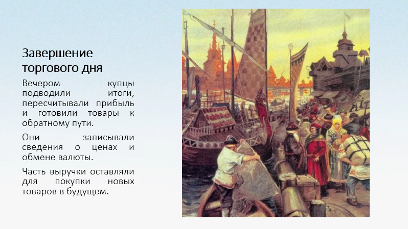 Добавить текст Вернуть оригиналВ ксенодохии купец подводит итог дня. В счётную книгу заносит цены, курс монеты, расходы на перевозку и хранение. Пишет письмо на Русь с перечнем того, что следует привезти к следующему рейсу: шёлк определённого цвета, вино из указанных погребов, стеклянные бусы.