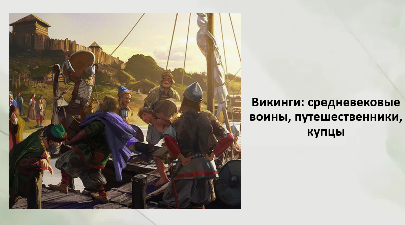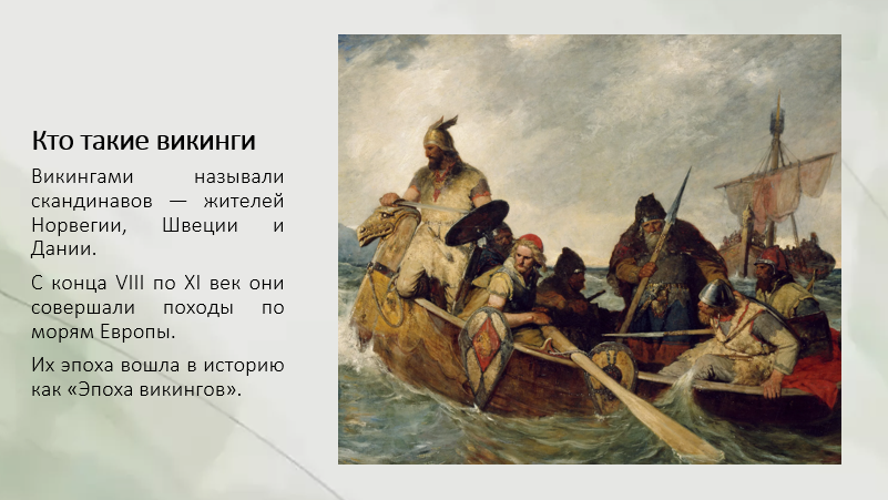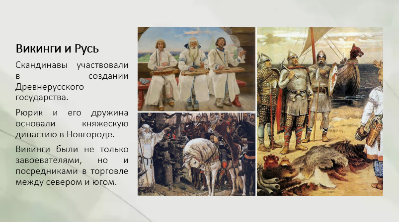 Добавить текст Вернуть оригиналНа Руси викингов называли варягами. Именно они сыграли важную роль в образовании Древнерусского государства. Рюрик, пришедший из Скандинавии, стал основателем княжеской династии, правившей на Руси многие века. Варяги участвовали в походах русских князей, охраняли торговые пути и служили в дружинах.