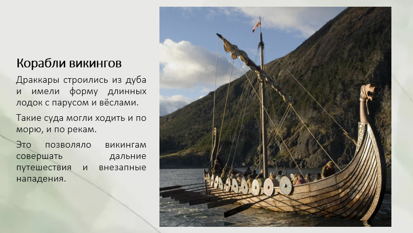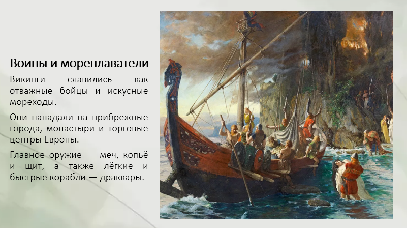 Добавить текст Вернуть оригиналВикинги славились своей храбростью и умением сражаться. Они владели мечом, копьём, топором и всегда носили щит. Их лёгкие и прочные корабли — драккары — могли проходить по морям и рекам, быстро высаживая воинов на берег. Благодаря этим судам викинги достигли берегов Франции, Англии, Испании, а позже — и далёких северных морей.