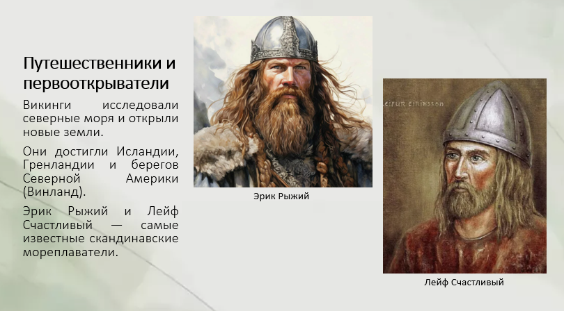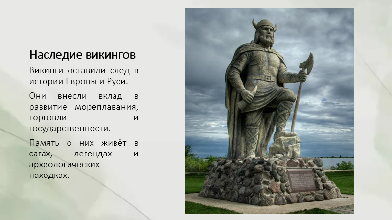 Добавить текст Вернуть оригиналНаследие викингов огромно. Они оставили после себя города, торговые пути, корабельные технологии и богатую культуру. Их саги и легенды рассказывают о мужестве, дружбе и поиске славы. Викинги стали символом целой эпохи, когда храбрость и стремление к открытиям изменили карту мира.
