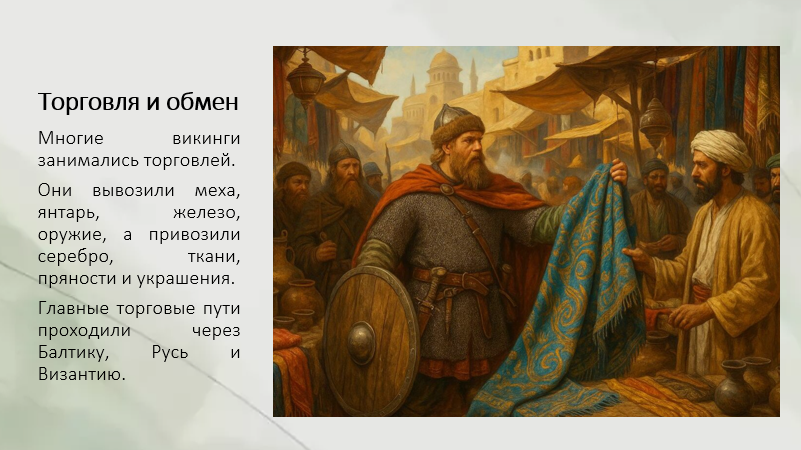 Добавить текст Вернуть оригиналОднако викинги были не только грозными воинами. Многие из них занимались торговлей. Они вывозили меха, янтарь, железо и оружие, а взамен получали серебро, ткани, вино, украшения. Их торговые пути проходили по Балтийскому и Чёрному морям, связывая Скандинавию с Византией и Востоком.