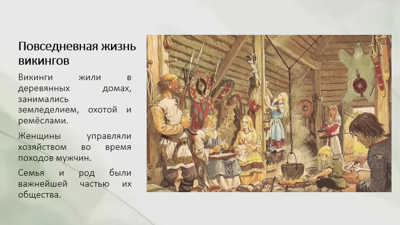Добавить текст Вернуть оригиналПовседневная жизнь викингов была трудовой. Когда они не воевали, мужчины занимались земледелием, рыбной ловлей и ремёслами, а женщины вели хозяйство и воспитывали детей. Викинги были хорошими мастерами — умели ковать оружие, строить корабли и изготавливать украшения.