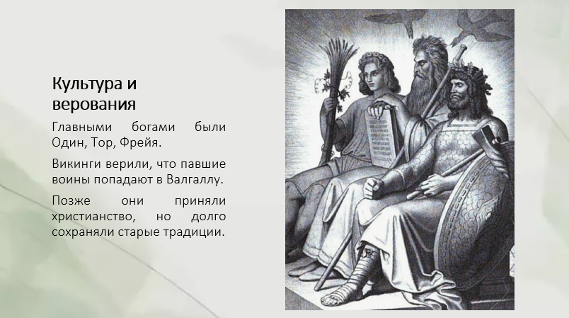 Добавить текст Вернуть оригиналИх вера была тесно связана с природой. Они поклонялись Одину, Тору и Фрейе, верили в Валгаллу — чертог павших воинов. Позже, под влиянием Европы, викинги приняли христианство, но старые обычаи сохранялись ещё долго.