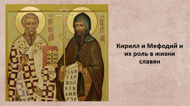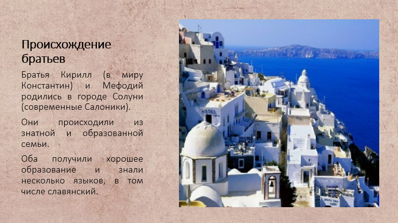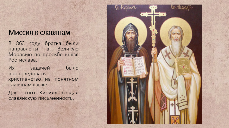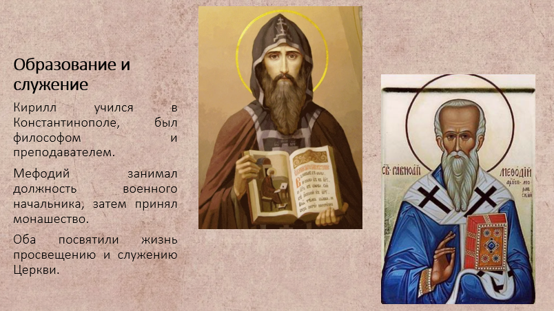 Добавить текст Вернуть оригиналКирилл и Мефодий вошли в историю как просветители славянских народов. Они родились в греческом городе Солуни, где жили люди разных культур и языков, в том числе славяне. Благодаря этому братья с детства понимали славянскую речь. Кирилл получил блестящее образование и стал философом, а Мефодий служил военачальником, но затем принял монашество.