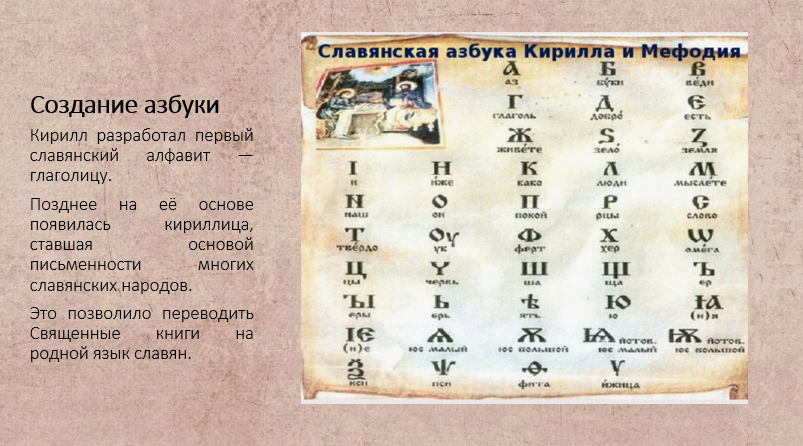 Добавить текст Вернуть оригиналВ 863 году князь Великой Моравии Ростислав обратился к византийскому императору с просьбой прислать учителей, которые могли бы проповедовать христианство на понятном народу языке. Император поручил это братьям Кириллу и Мефодию. Подготовившись к миссии, Кирилл создал первую славянскую азбуку — глаголицу, чтобы перевести на славянский язык Священные книги. Это стало величайшим достижением эпохи.