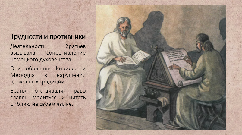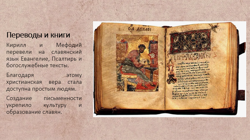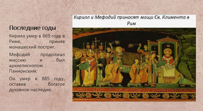 Добавить текст Вернуть оригиналПосле смерти Кирилла Мефодий продолжил просветительскую работу и стал архиепископом. Он до конца жизни служил делу просвещения. Их ученики распространили славянскую письменность в Болгарии, Сербии, на Руси.