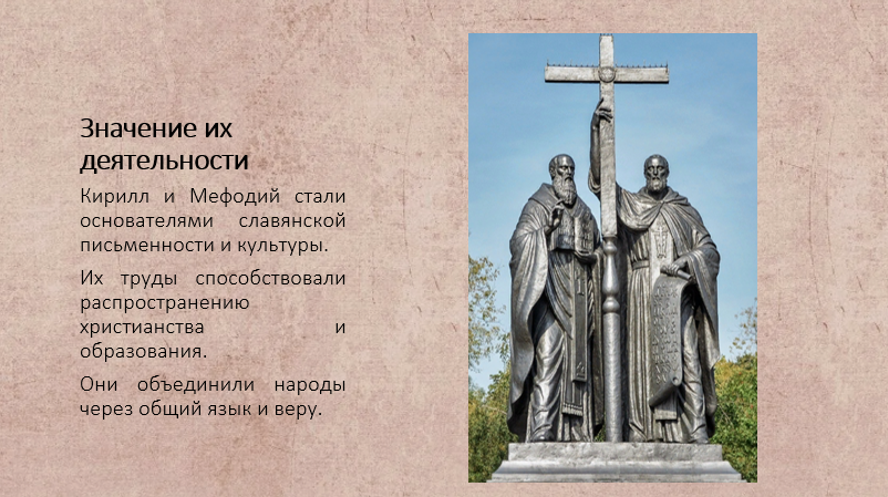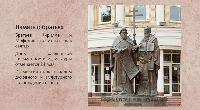 Добавить текст Вернуть оригиналДело братьев стало основой письменной культуры славянских народов. На базе глаголицы возникла кириллица, которой пользуются миллионы людей и сегодня. Кирилл и Мефодий почитаются как святые равноапостольные, а их труд стал символом единства славянских народов, их духовного и культурного возрождения.