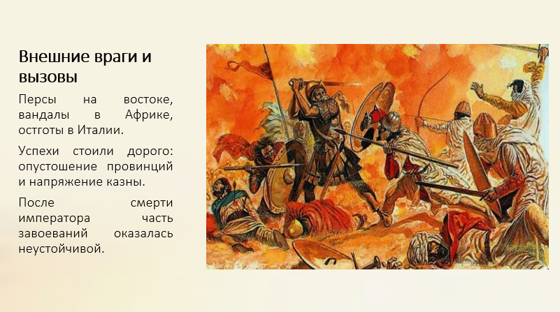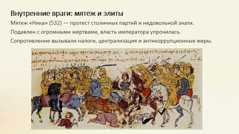 Добавить текст Вернуть оригиналНо у Юстиниана были и враги. Внутри государства против него выступали столичные партии, влиятельные роды и те, кого тяготили налоги и централизация. Снаружи его силы испытывали персидские цари и «варварские» королевства Запада. Каждая победа требовала денег, людей и времени; пока армия штурмовала Равенну, границы на востоке требовали новых гарнизонов.