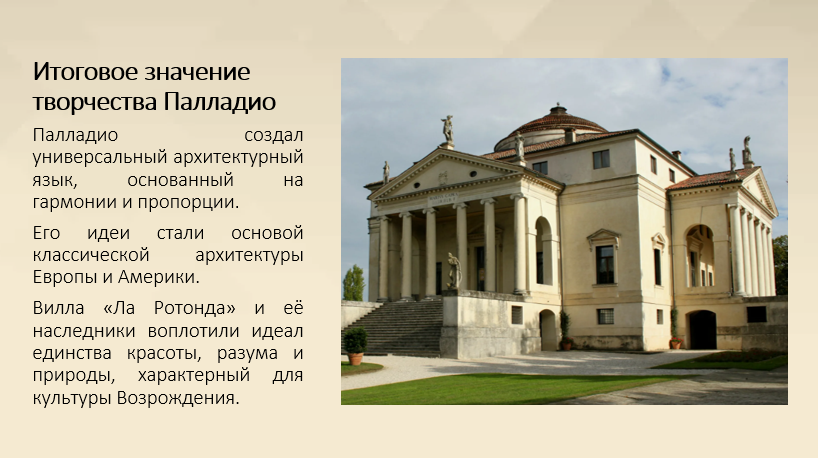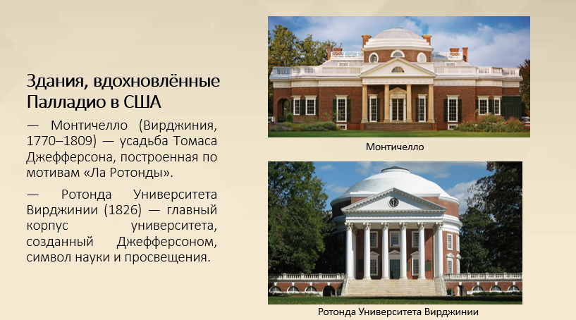 4. Используя ресурсы Интернета, подготовьте презентацию о влиянии Палладио на архитектуру последующих веков. Найдите здания, которые напоминают Ла Ротонду.