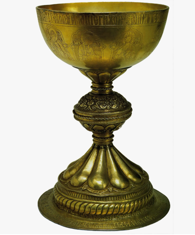Добавить текст Озвучить Вернуть оригиналПотир (чаша для Причастия, 1598 г.) . Предметы, связанные с богослужением, отличаются особой роскошью. Этот золотой потир, упоминаемый в учебнике, демонстрирует высочайшее искусство чеканки и гравировки.