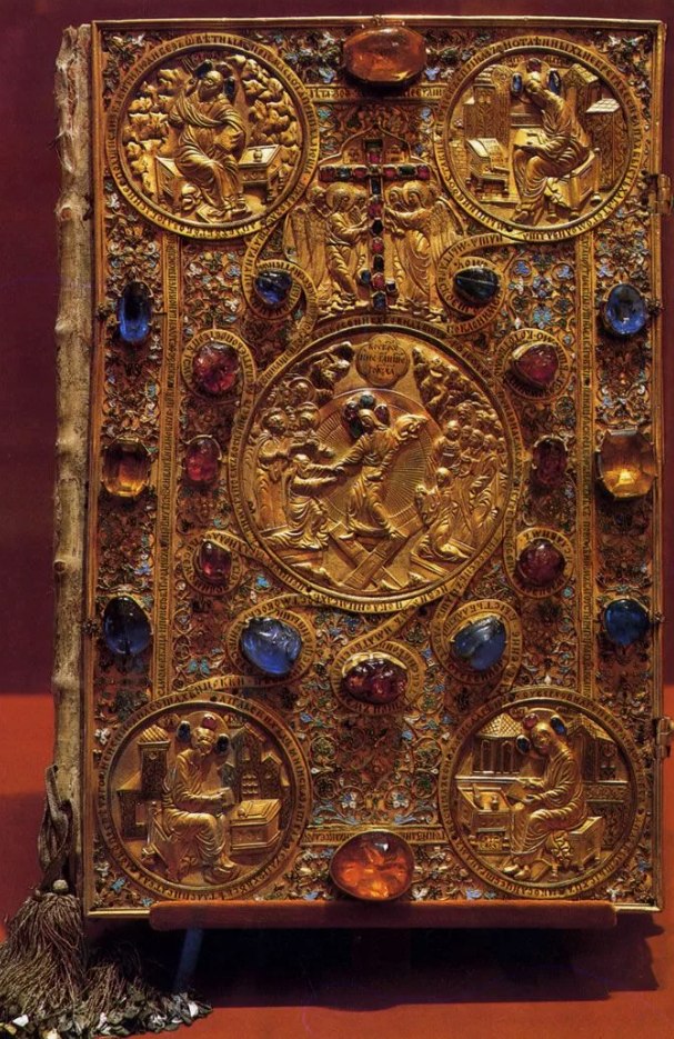 Золотой оклад Евангелия XVI в. . Оклады (внешнее оформление) Евангелий XVI века, например, золотой оклад Одигитрии, являются подлинными шедеврами. Они выполнены с применением техник басмы, скани, зерни, украшены жемчугом и драгоценными камнями, что отражает безграничное почитание святыни. Это демонстрирует расцвет ювелирного мастерства, когда оклады превращались в самостоятельные произведения искусства.