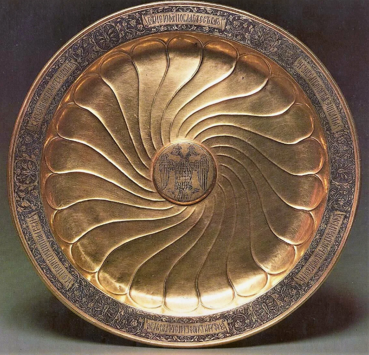 Блюдо (1561 г.) . Серебряные и золотые блюда, использовавшиеся на царских пирах, демонстрируют мастерство чеканки и гравировки. Блюдо 1561 года с растительным или геометрическим орнаментом показывает высокий уровень светского прикладного искусства.