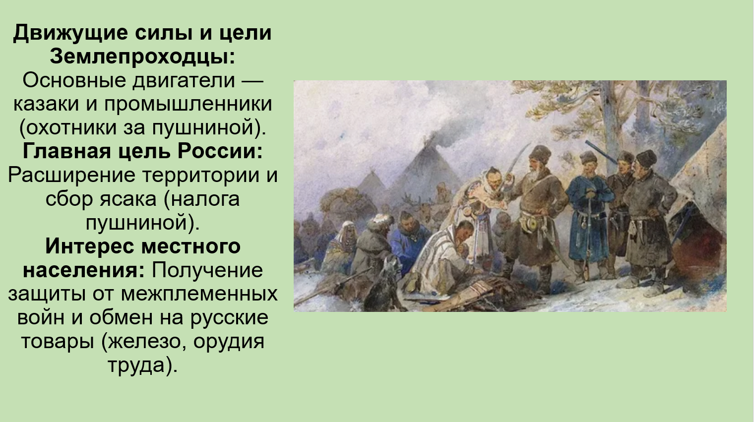 Добавить текст Озвучить Вернуть оригиналВзаимоотношения: Взаимоотношения с местным населением были в основном мирными (в отличие от европейской колонизации), хотя и основывались на сборе ясака.