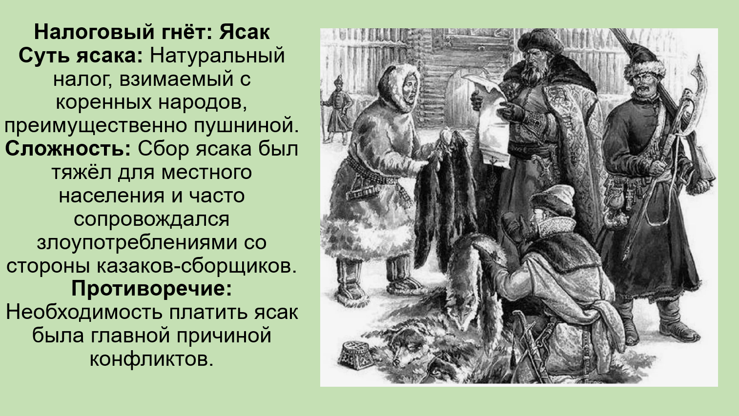 Добавить текст Озвучить Вернуть оригиналНалоговый гнёт: Основным элементом был ясак (налог пушниной), который был тяжёл для местного населения.