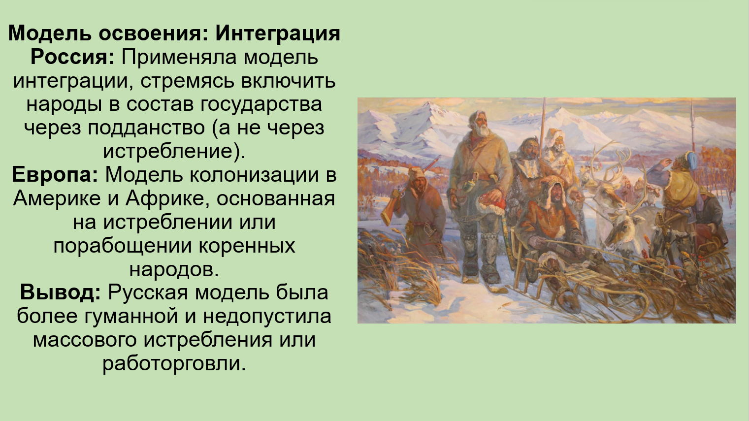 | Модель | Модель интеграции и сотрудничества (обмен опытом, перенимание хозяйственных навыков). | Модель колониального захвата и эксплуатации. |
