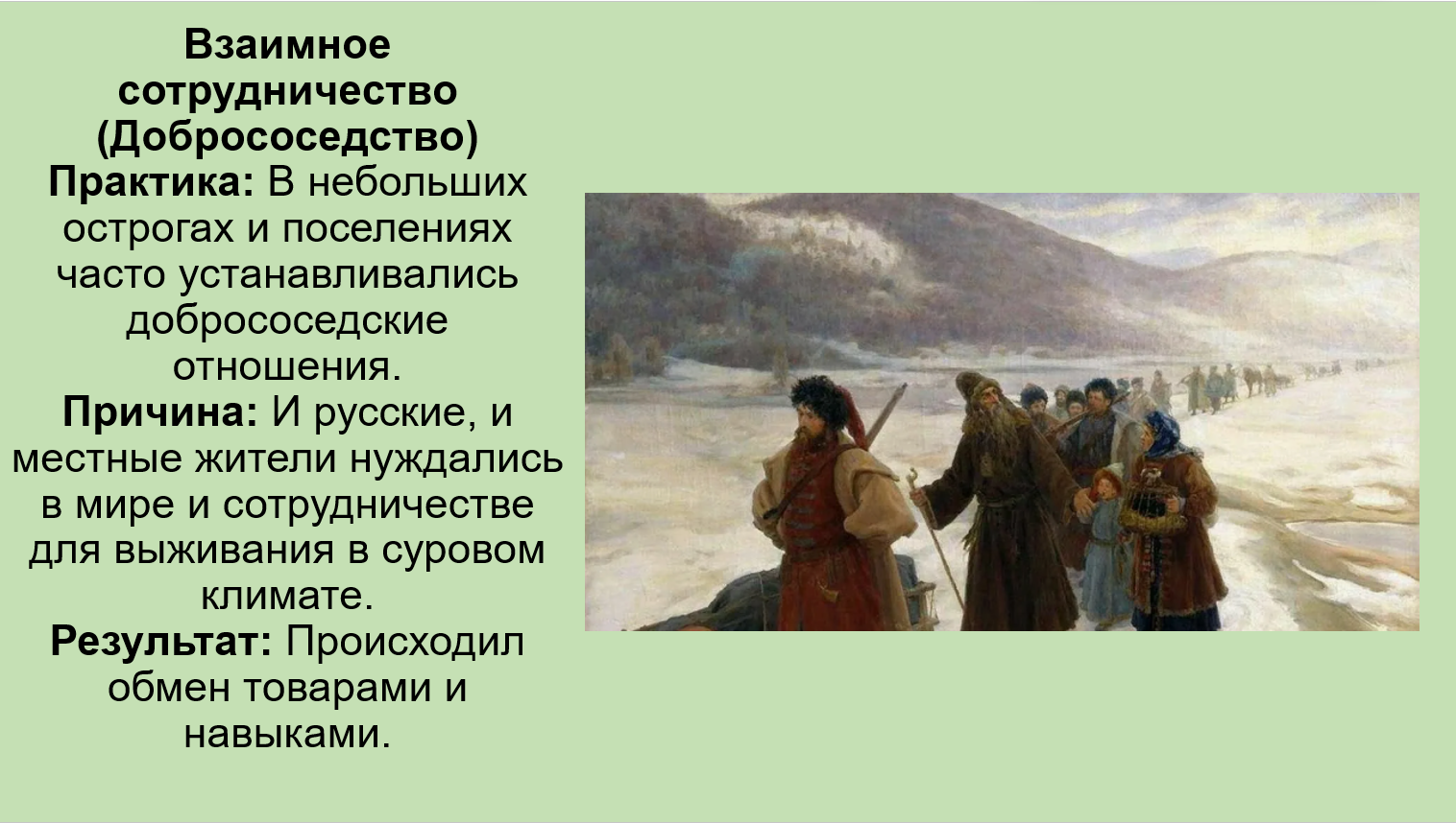 Добавить текст Озвучить Вернуть оригиналДобрососедство: Царские власти поощряли мирное и добрососедское сосуществование русских переселенцев и местного населения, что способствовало обмену хозяйственным опытом (пашенное земледелие, орудия труда).