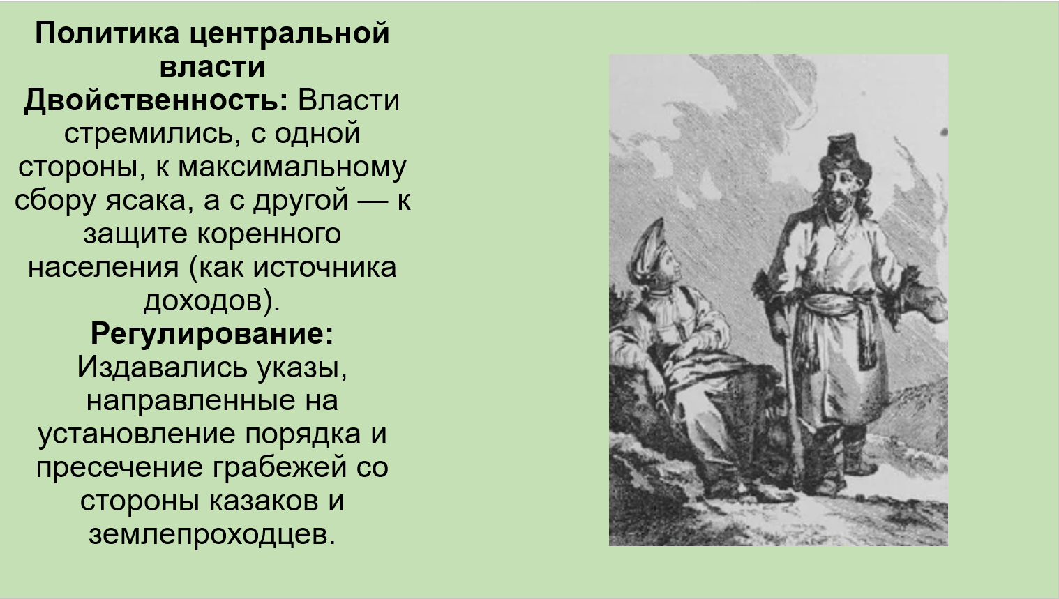 Добавить текст Озвучить Вернуть оригиналЗащита: Правительство стремилось прекратить губительные межродовые усобицы и защищало нерусское население от чрезмерной эксплуатации со стороны казаков и промышленников.