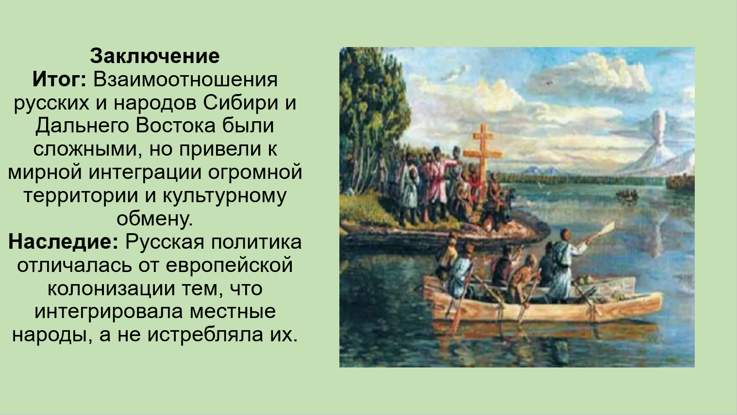 Добавить текст Озвучить Вернуть оригиналУникальная модель освоения: Освоение Сибири прошло по иной модели, чем европейская колонизация. Оно привело к прекращению межродовых усобиц и мирному культурному обмену (введение земледелия), что способствовало развитию коренных народов.