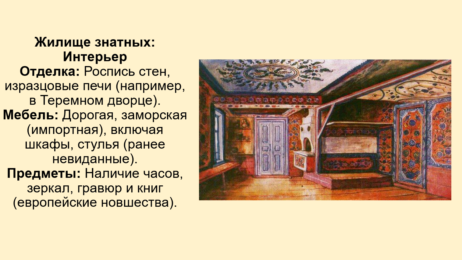 Добавить текст Вернуть оригиналВещи: В быт вошли иностранные вещи (часы, новая мебель, одежда, гравюры, книги на иностранных языках).
