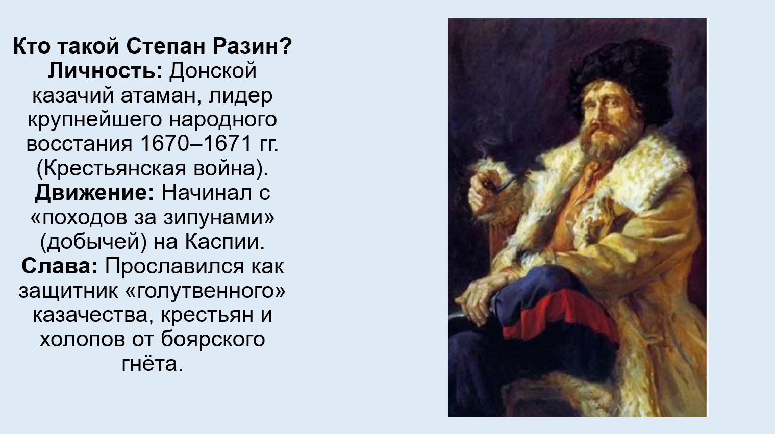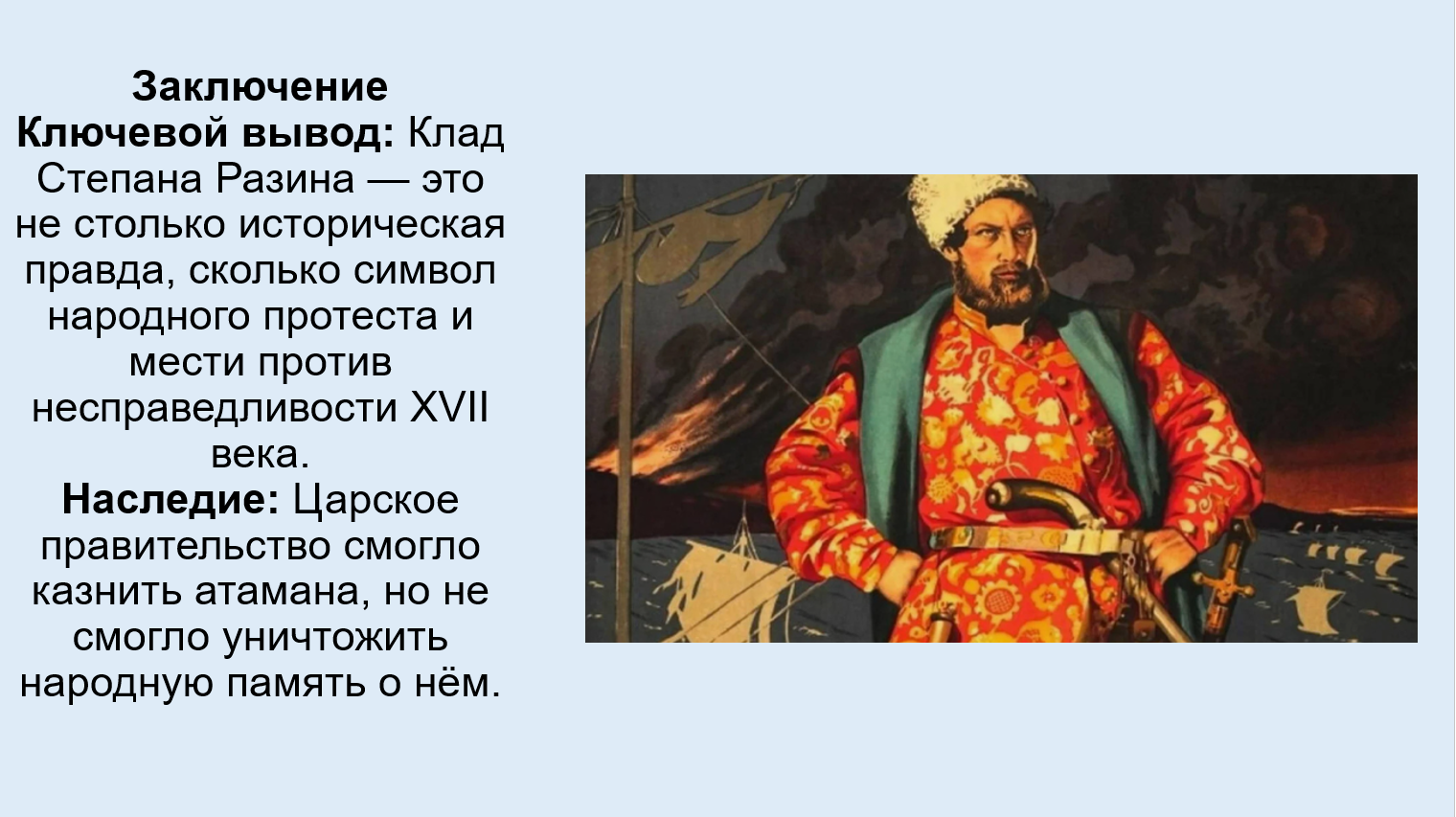 Добавить текст Озвучить Вернуть оригиналНародный герой: В глазах крестьян и голутвенного казачества он стал «народным героем» и символом борьбы за социальную справедливость («защитить всех обиженных», «бить бояр»). Эта идеологическая подоплёка отличает его от обычного разбойника.