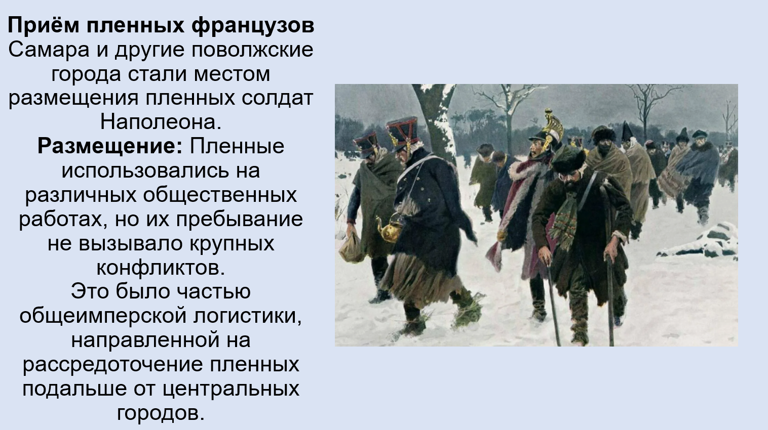 На картине «В 1812 году» (Прянишников) изображён эпизод захвата французов в плен русскими крестьянами в зимнее время. Крестьяне, одетые в тулупы, с бородами, вооружены дубинами и топорами, что говорит о всенародном и партизанском характере войны. Они конвоируют нескольких замёрзших, измождённых и, вероятно, голодных французских солдат, которые уже не оказывают сопротивления. Это отражает полный упадок боеспособности французской армии в ходе отступления из России и активность крестьянского партизанского движения.