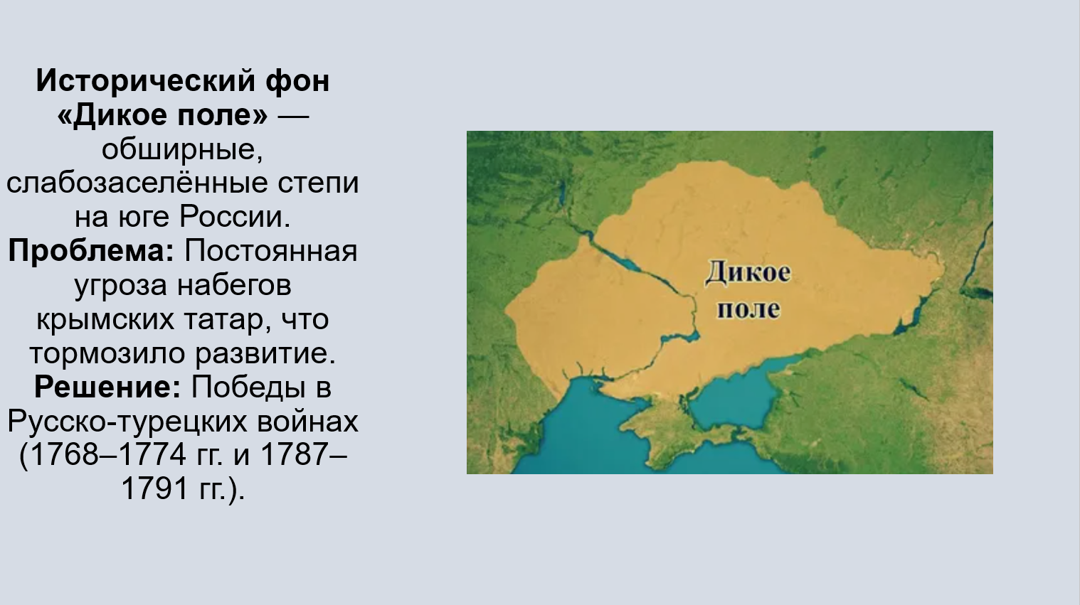 Добавить текст Вернуть оригиналСложность освоения: Сами земли Дикого поля были огромны, не заселены и требовали колоссальных усилий для строительства городов, портов и инфраструктуры, а также защиты от татарских и кочевых племён.