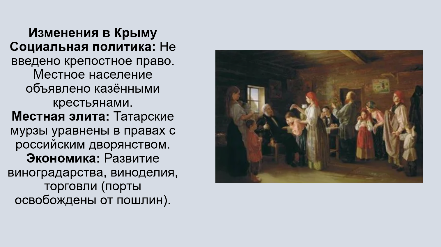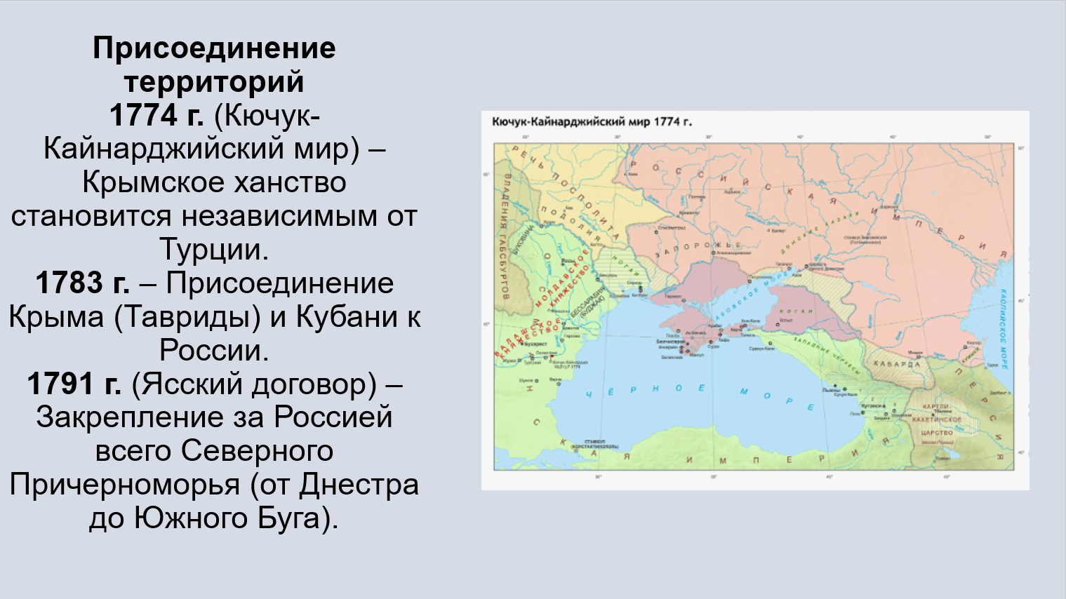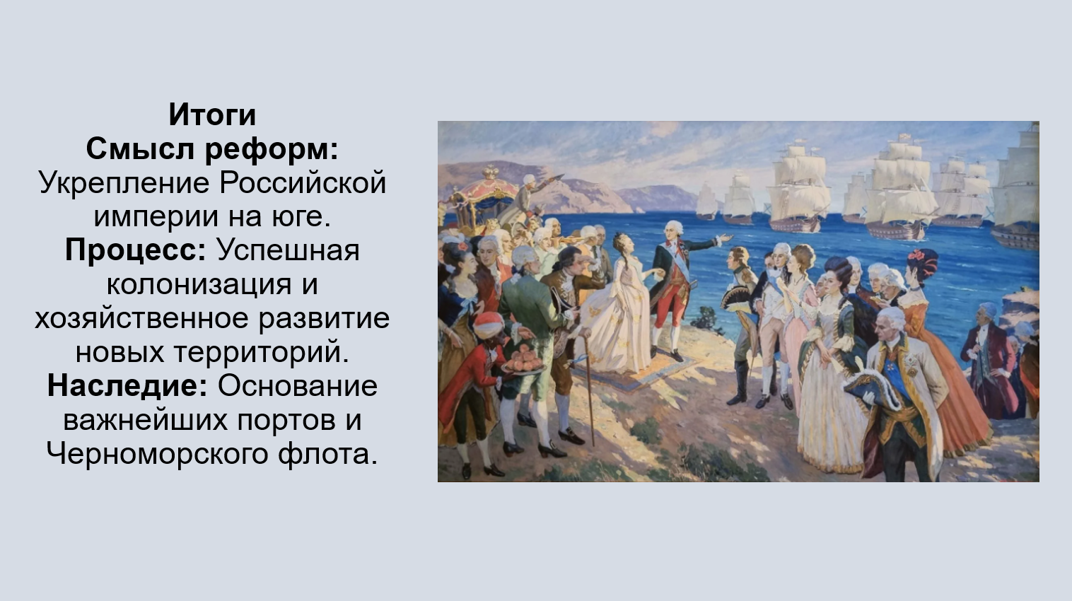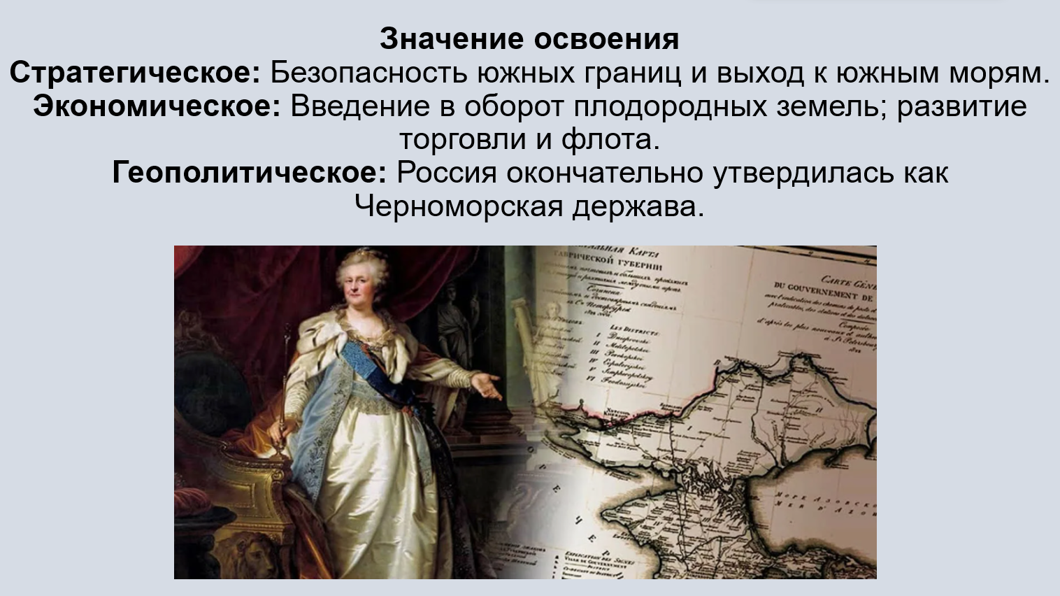 Добавить текст Вернуть оригиналОсвоение территории: Были созданы новые города (Херсон, Севастополь, Екатеринослав), военные базы и порты.