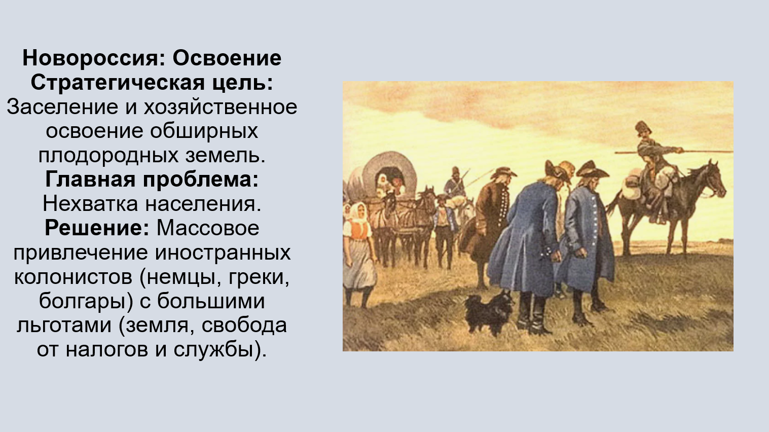 Добавить текст Вернуть оригиналЗемля и деньги: Каждой семье выделялись большие земельные участки (до 60 десятин) и льготные кредиты. Роль в освоении: Иностранные переселенцы сыграли ключевую роль в хозяйственном освоении Новороссии, внедряя европейские методы земледелия и новые культуры. Примеры: