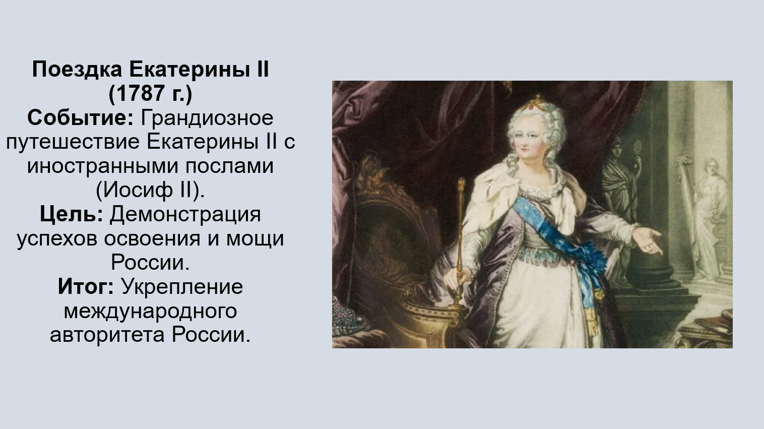 Добавить текст Вернуть оригиналМаршрут: Началась из Петербурга, пролегала через Киев, где она встречалась с Иосифом II, затем на галерах по Днепру в Новороссию и в Крым (самая южная точка – Феодосия).