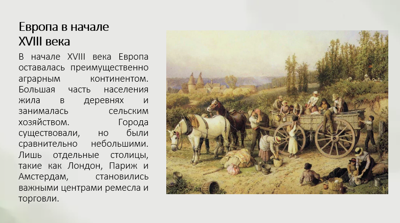 • В деревне и городе: В деревне по-прежнему преобладало сельское население, а в городах произошли изменения благодаря урбанизации — увеличилась численность городов и их роль. Крестьяне стали чаще покупать городские товары, а дома земледельцев стали перестраиваться по новой моде.