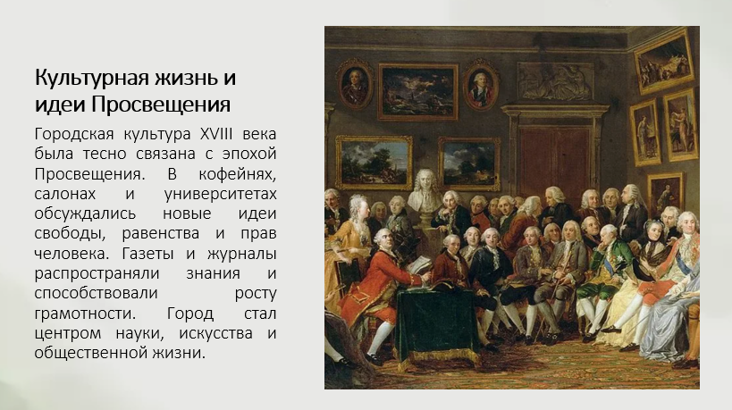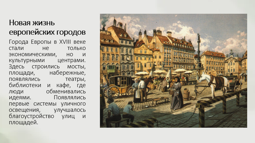 2. Модернизация городской жизни: Рост городов (урбанизация) и стремление к рациональности вызвали изменения в облике городов: появились регулярное освещение, полиция, нумерация домов и новые кварталы с широкими улицами, что сделало городскую жизнь более безопасной и упорядоченной по сравнению с нерегулируемым хаосом прошлого.