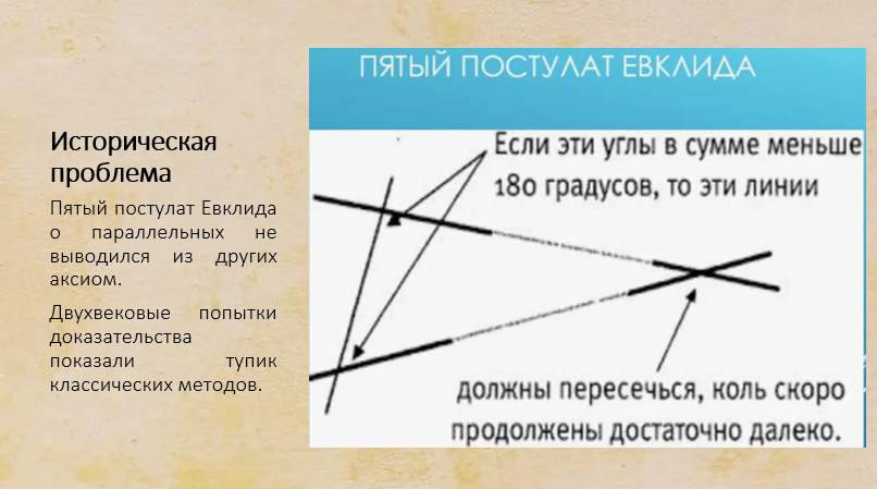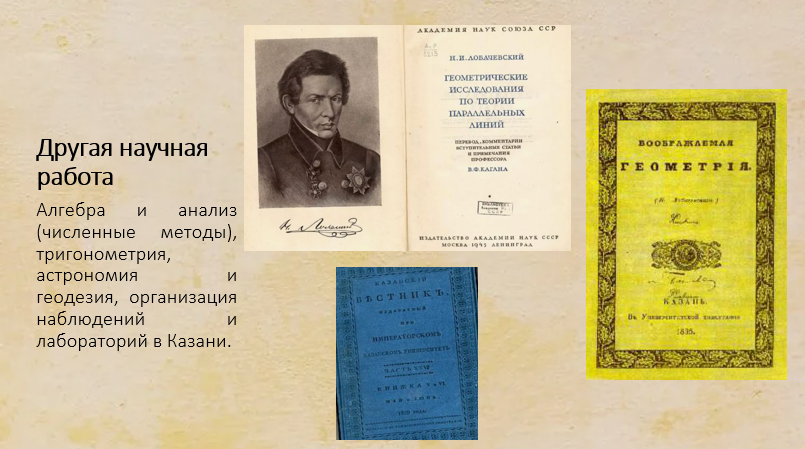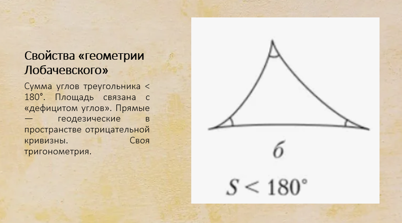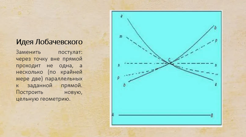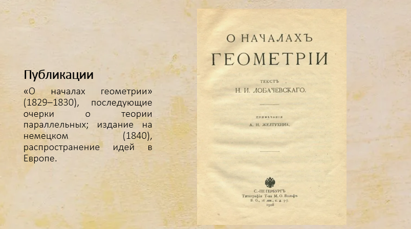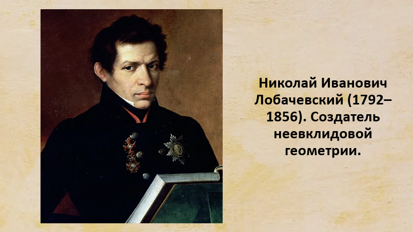 Н. И. Лобачевский (1792–1856) — русский математик, ректор Казанского университета, создатель неевклидовой (гиперболической) геометрии. В 1829–1830 годах он опубликовал работу «О началах геометрии», где предложил новую систему аксиом, заменив постулат Евклида о параллельных: через точку вне прямой проходят по крайней мере две параллельные к данной. На этой основе Лобачевский построил цельную геометрию: ввёл новые формулы для треугольников, понятие угловой суммы меньше 180°, модели прямых как геодезических, тригонометрию на плоскости постоянной отрицательной кривизны. Его теория была внутренне непротиворечивой и равноправной с евклидовой.
