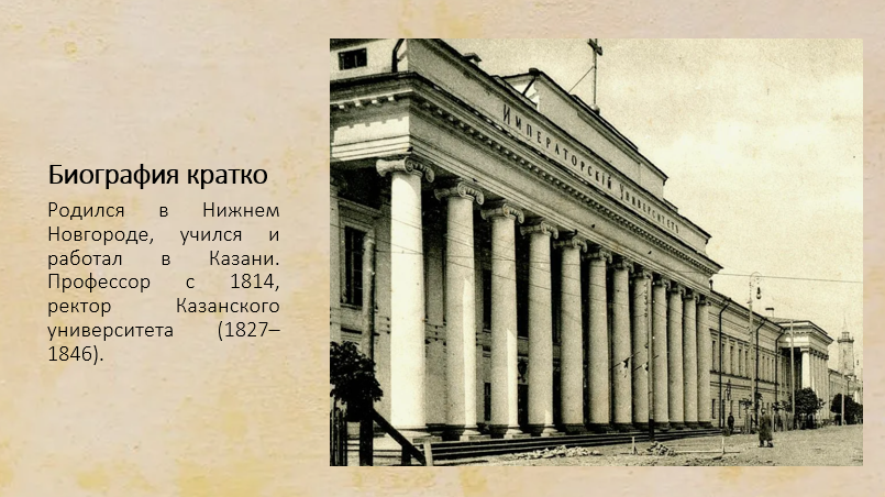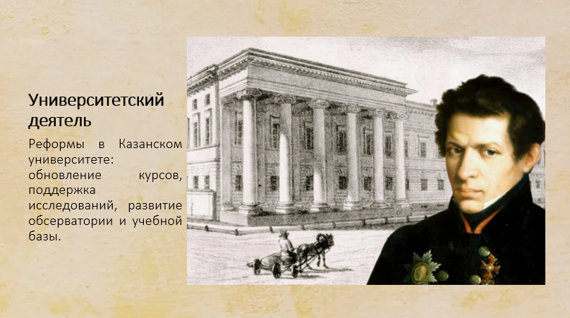 Учёный развил методы аналитической геометрии и тригонометрии, занимался алгеброй (численные методы решения уравнений), математическим анализом, астрономией и геодезией (организовал в Казани наблюдения, продвигал точные измерения земной поверхности). Как ректор Казанского университета (1827–1846) модернизировал преподавание, поддерживал исследования, создал условия для работы обсерватории и кабинетов.