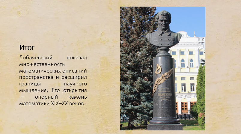 1. Вклад в мировую математику и физику: Открытия Н.И. Лобачевского (неевклидова геометрия) и Э.Х. Ленца (закон Джоуля-Ленца) были фундаментальными и оказали влияние на дальнейшее развитие этих наук, войдя в учебники и став основой для новых исследований по всему миру.
