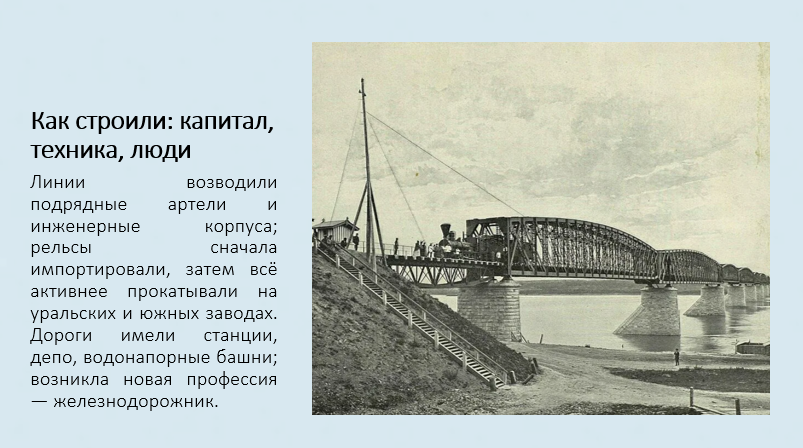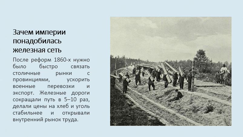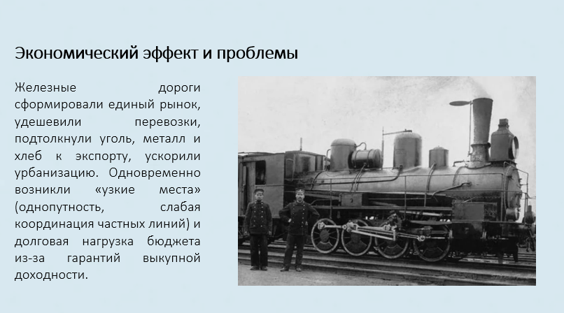 Добавить текст Вернуть оригиналСтимулирование тяжелой промышленности: Строительство железных дорог стало «локомотивом» для развития металлургии (рельсы, вагоны, паровозы) и топливной промышленности, что способствовало завершению промышленного переворота и индустриализации страны.