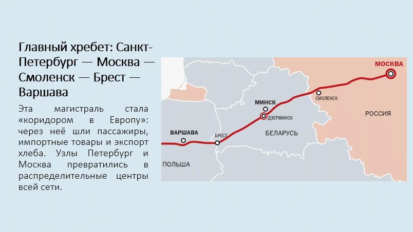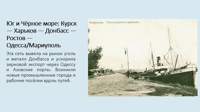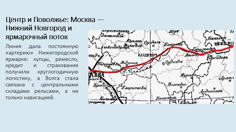 Добавить текст Вернуть оригиналЖелезные дороги строились по направлениям, связывающим промышленные и сырьевые центры с торговыми путями и портами и столицей (Москвой). Ключевые линии 1870-х гг. включали: Москва – Курск – Харьков – Одесса/Ростов, Москва – Ярославль, Москва – Нижний Новгород и Москва – Брест.