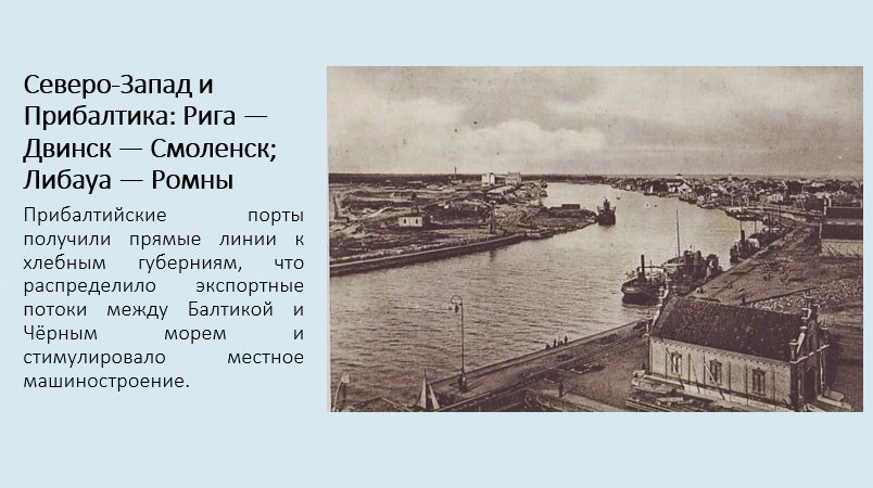 Добавить текст Вернуть оригиналФормирование всероссийского рынка: Развитая железнодорожная сеть связывала отдаленные регионы, обеспечивая быстрый вывоз сырья и хлеба к портам, что способствовало развитию внутренней и внешней торговли (грузооборот увеличился на 59% за 16 лет).