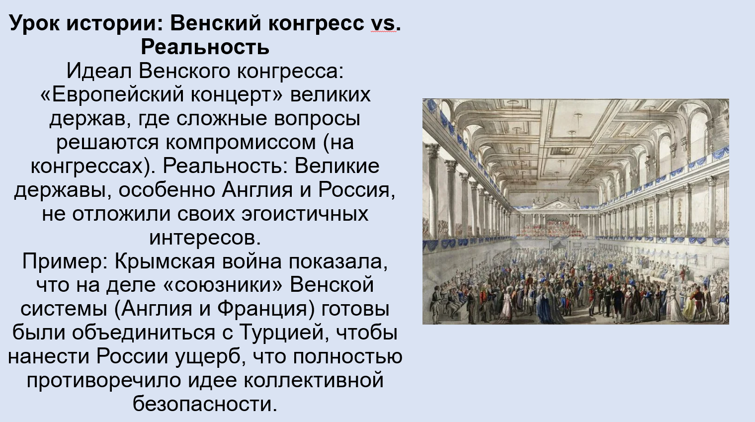 Добавить текст Озвучить Вернуть оригиналПринципы Венской системы (поддержание баланса сил, легитимизм).