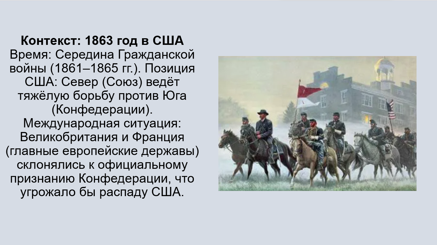 5. Увидев на рейде Нью-Йорка в 1863 г. российские корабли, американский морской министр записал в дневнике: «Господь, благослови русских!» Подготовьте презентацию, в которой выясните, как и почему они там оказались и прав ли был министр, оценивая это как поддержку.