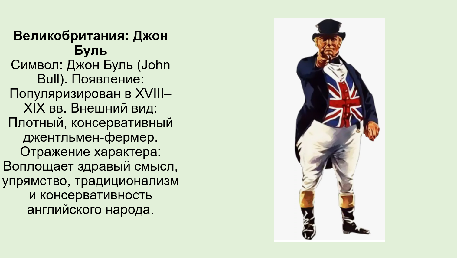 Добавить текст Озвучить Вернуть оригиналНациональный характер: Воплощает консерватизм, здравый смысл, упрямство и традиции английского народа.